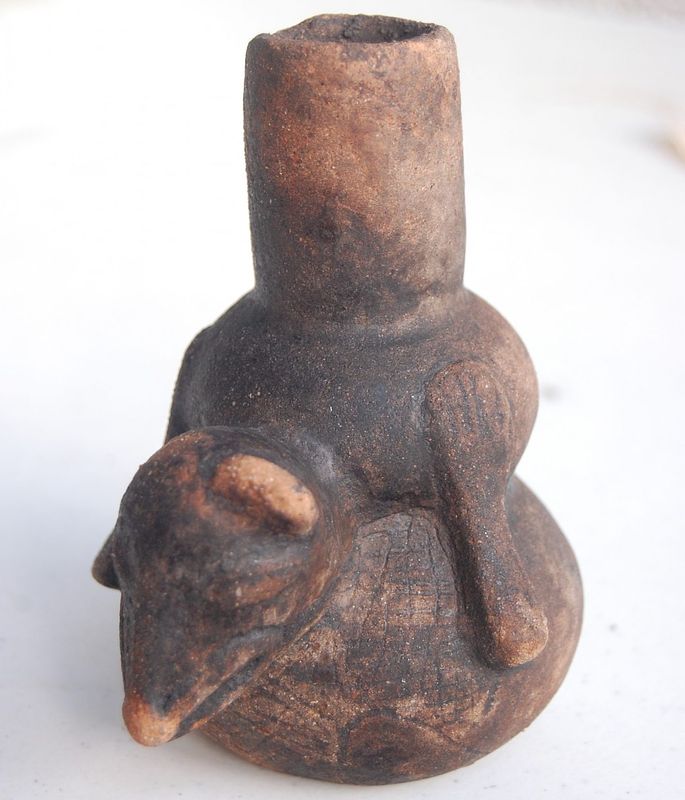 With Deb Nichols, my Formative period work in central Mexico focuses on the small site of Altica (funded by NSF and NGS). It is the oldest dated site in the Teotihuacan Valley (1250-850 cal BC), and therefore crucial for understanding later developments in the region. Prior to the settlement of Altica, most of the sedentary villages in the Basin of Mexico occupied the slightly warmer and wetter portions of the southern Basin. The Teotihuacan Valley was more arid and cold. The dangers of frosts and lower annual precipitation made the Teotihuacan Valley less attractive to early agriculturalists. Altica was situated high in the Patlachique Range: this elevation likely kept Altica above the frost zone, as cold air sinks down to the valley bottom. Our excavations there identified some of the earliest formal metates (grinding stones used to process maize) in the Basin of Mexico. Signs that certain individuals had achieved status above that of the common. We also identified incipient social differentiation. Some individuals were buried with grave goods, such as the possum effigy bottle depicted below, indicating that they had achieved status in life.